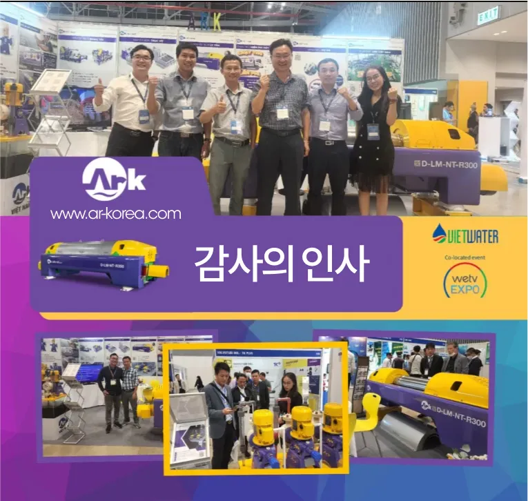 베트남의 원심탈수기. 벨트프레스와 필터프레스가 아닌 최신 트렌드이자 표준화가 되어 가고 있는 데칸터형 원심탈수기는 이제 에이알케이의 마스코트가 되었고 베트남에선 컨설팅과 시운전 서비스까지 서비스를 하고 있습니다.